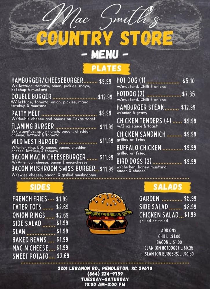 Welcome to Mac Smith's Country Store, a hidden gem nestled in the heart of South Carolina! Our charming general store offers an unforgettable dining experience with some of the best burgers, hotdogs, and chicken tenders around. Enjoy a casual meal on our lovely terrace or grab a quick bite to go. With a diverse selection of teas and local specialties, we promise a delightful culinary adventure. Our welcoming atmosphere caters to everyone, including students, families, and tourists, with accessible seating and amenities. Stop by for lunch or dinner and discover why we’re a local favorite!